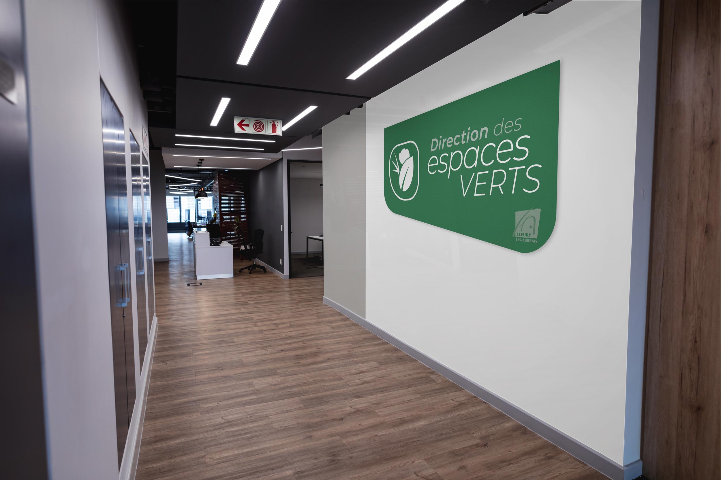 Dans le cadre de la construction du nouveau bâtiment accueillant la direction du service des Espaces Verts et dans la continuité de la réfonte de la signalétique des services de la Ville, voici le logo figurant sur le bâtiment et sur la signalétique intérieure du bâtiment que j’ai eu le plaisir de réaliser.